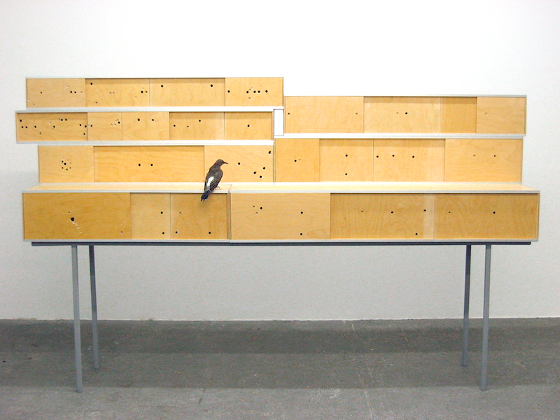 Name: Untitled (front), 2003 - wood, steel, aluminium, stuffed wood pecker, wood paneling, thermometer - variable dimensions.