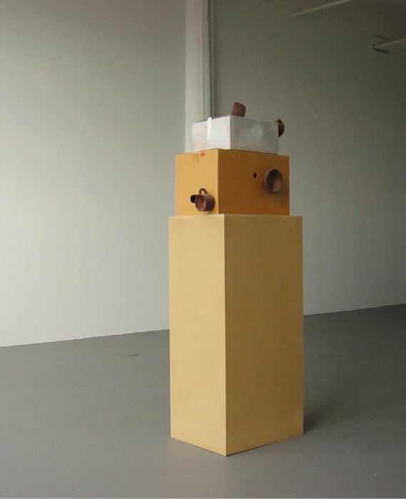 Name: “Handmade American Paranoia 1 and the architectural breakdown of nostalgia or the transmission and receiving of the technological sublime in the life of a 70’s liberal child” 2000, Cardboard boxes, paint, ceramic mgs, MDF, laser, and graphite on paper