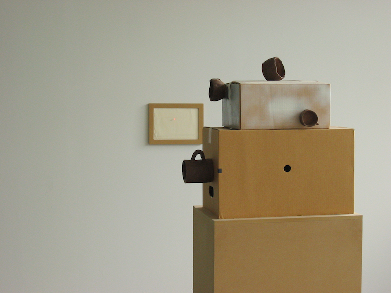 • Name: “Handmade American Paranoia 1 and the architectural breakdown of nostalgia or the transmission and receiving of the technological sublime in the life of a 70’s liberal child” 2000, Cardboard boxes, paint, ceramic mgs, MDF, laser, and graphite on paper