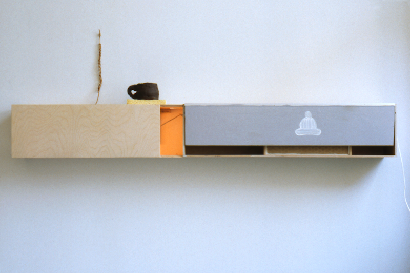 Name: “Contemporary Don Judian utilitarian reference with Eastern mystical shrine possibilities amid recollections of reading Siddartha at 16”, 1999-2000 wood, hardware, enamel, clay, leather, caulking, sponge, and wiring, dimensions: 6’ x 9” x 8”