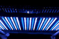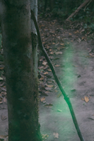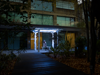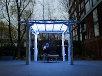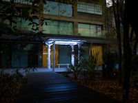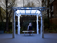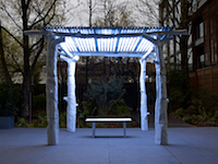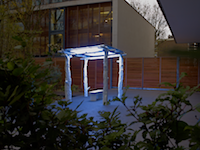 "The Summer Shelter Retreats Darkly Among the Trees" 2011, 12'x12'x12', Cast aluminum, matte white powder coat paint, T5 light bulbs tuned to the wavelengths used to treat depression (SAD or seasonal affective disorder), steel roofing, weather tight light casings, misc. hardware