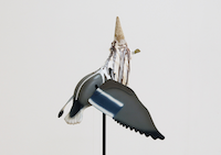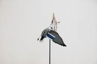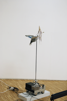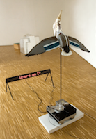 “Ice Cream Headache Migration” (Detail), A GPS unit is attached to the sculpture and placed outside via a long cable. The GPS allows the sculpture to determine its location on the planet. Once the sculpture knows where it is, the duck begins to fly towards the various locations where it is from.. It calculates the shortest distance to the location and flies in that direction. The locations are displayed on the LED sign.