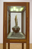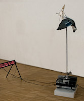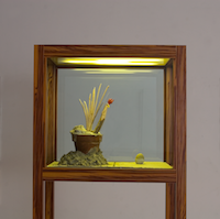 2006, Concrete, terracotta flower pot, handcrafted hickory wood rooster carved by an unknown North Carolinian Appalachian artist, aluminum, powder coating, cold cathode fluorescent lights, velvet, wood, acrylic, glue, and miscellaneous hardware – variable dimensions