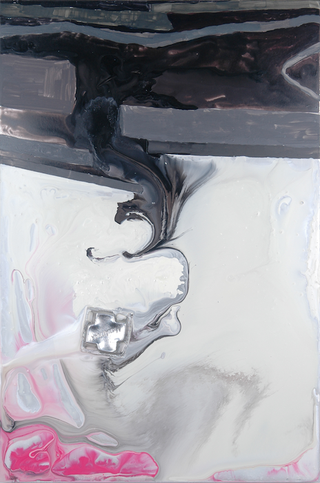 Name: "MaxAttax", 2007, enamel and cast aluminum roach trap on aluminum, 24" x 16"