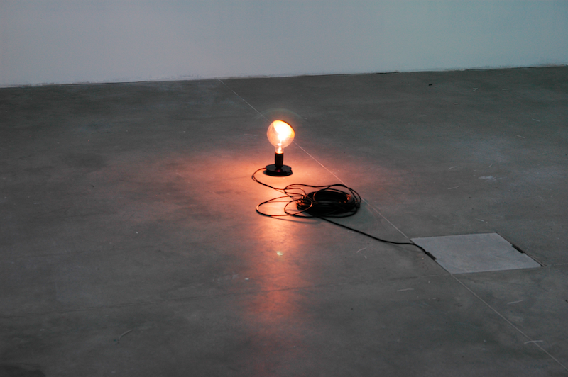 Caption: 2005, Dimensions variable, This sculpture is a remake of a famous pop lamp designed in 1971 by the Italian designer Archille Castiglioni. The original was made using a tape reeel as a base and a bulb that had been partially frosted as a defusser. Light bulb, CD-R's ( Copy of Kanye West's CD "Late Registration" + his comments made on live national TV in the aftermath f Hurricane Katrina where he said, "George Bush Doesn't Care About Black People", Copy of the CD "The College Dropout") , gold leaf, spray paint, electrical cord and miscellaneous hardware