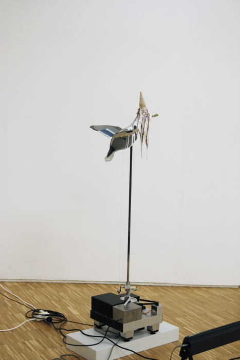 Name: “Ice Cream Headache Migration” (Detail), A GPS unit is attached to the sculpture and placed outside via a long cable. The GPS allows the sculpture to determine its location on the planet. Once the sculpture knows where it is, the duck begins to fly towards the various locations where it is from.. It calculates the shortest distance to the location and flies in that direction. The locations are displayed on the LED sign.