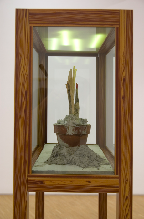Caption: 2006, Concrete, terracotta flower pot, handcrafted hickory wood rooster carved by an unknown North Carolinian Appalachian artist, aluminum, powder coating, cold cathode fluorescent lights, velvet, wood, acrylic, glue, and miscellaneous hardware – variable dimensions