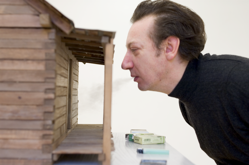 The sculpture consists of a little log cabin with a pack of cigarettes on the porch. The sculpture is displayed a little lower than head height. If a cigarette is lit and the smoke is blown inside the cabin door, a karaoke track of several people with Japanese accents singing Johnny Cash’s Ring of Fire comes on. A small laser ligth shows also begins. If the smoke dissipates, everything stops and the cabin returns to darkness and quiet, which is its normal state.”