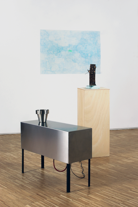 Name: “Handmade American Paranoia n°3 with practical independence, or why we aspire to be like our neighbors mind the threesome” 2005 - steel, wood, polystyrene, glass, chainsaw, alternator, car battery, wire, green plumped laser and misc. electronics - 71x83x30 cm - pedestal: 123x35x37 cm