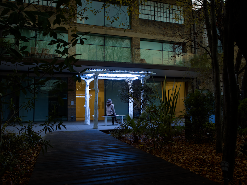 Name: "The Summer Shelter Retreats Darkly Among the Trees" 2011, 12'x12'x12', Cast aluminum, matte white powder coat paint, T5 light bulbs tuned to the wavelengths used to treat depression (SAD or seasonal affective disorder), steel roofing, weather tight light casings, misc. hardware