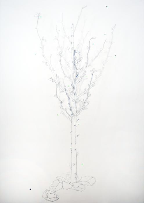 Name: Untitled (detail, see first image for explanatory text), showing drawing of tree with split green laser light