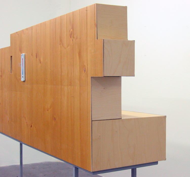 Name: Untitled (detail), 2003 - wood, steel, aluminium, stuffed wood pecker, wood paneling, thermometer - variable dimensions.