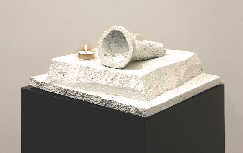 Caption: 2010, Cast aluminum, flame proff white matte paint, candle, fire, acrylic, high-output white LED, electronics, 32" x 15" x 15"