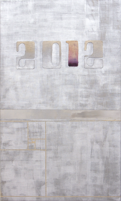 Caption: 2009, Linen, spray paint, water color, glue, on linen, mounted on aluminum, 3'x4'